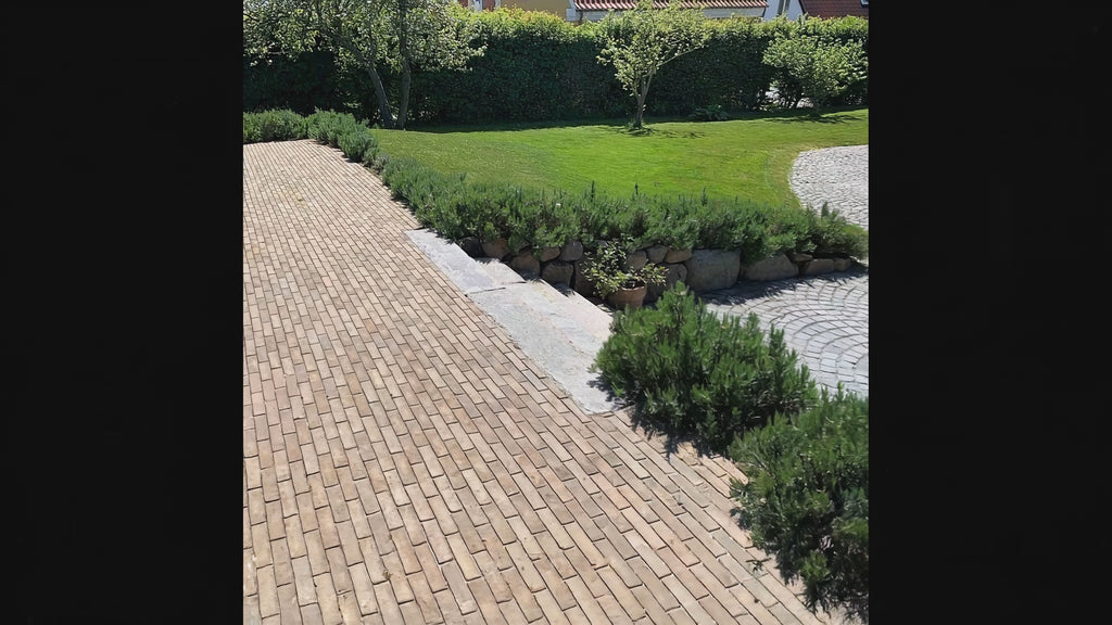 - På højkant (60 mm tykkelse): Her vender du den smalle side opad (50 mm bredde). Dette giver en utrolig stærk belægning, der er godkendt til personbilstrafik i indkørslen. Det slanke format er desuden ideelt til det populære sildebensmønster.