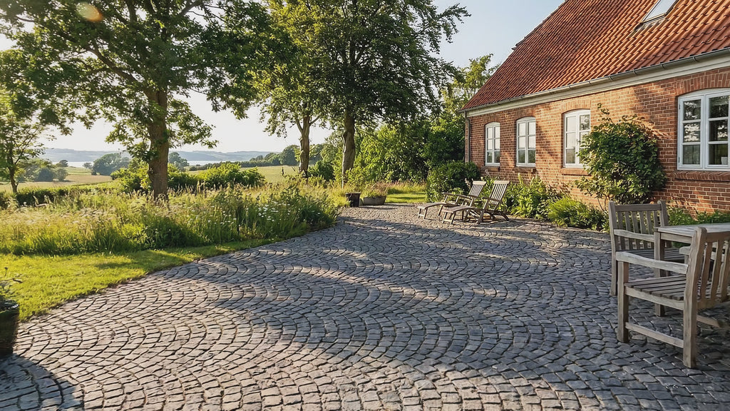 - Sættelag: 3-5 cm brolæggergrus (afretningssand), som stenene sættes direkte i med en brolæggerhammer.
