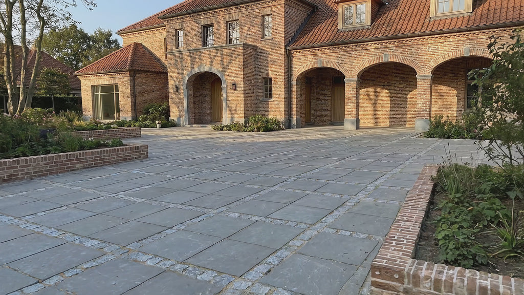 En ren flade af grå betonfliser kan med fordel brydes for at skabe liv. Drømmehave anbefaler ofte at bruge sorte chaussesten som kantafgrænsning eller til at inddele parkeringsbåse. Kombinationen af den stringente beton og den rustikke natursten giver et eksklusivt og færdigt udtryk.