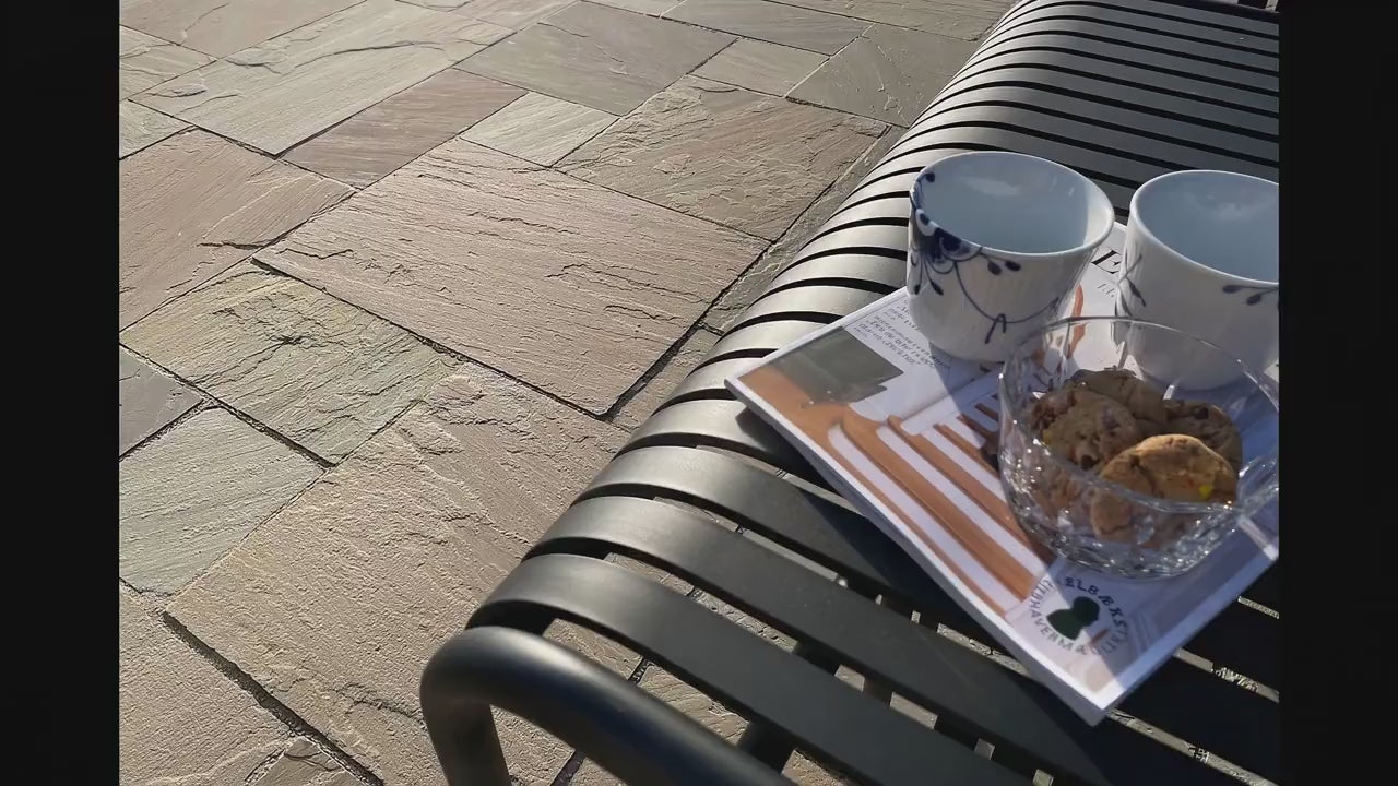 Drømmer du om en terrasse, der leder tankerne hen på varme himmelstrøg? Sandsten i farven "Mahogni" er en smuk, rødbrun kvartsit, der tilføjer en autentisk og hyggelig atmosfære til din have. Naturstenens spil varierer fra dybe brune toner til lettere rødlige nuancer, hvilket giver en levende belægning, man aldrig bliver træt af at se på.