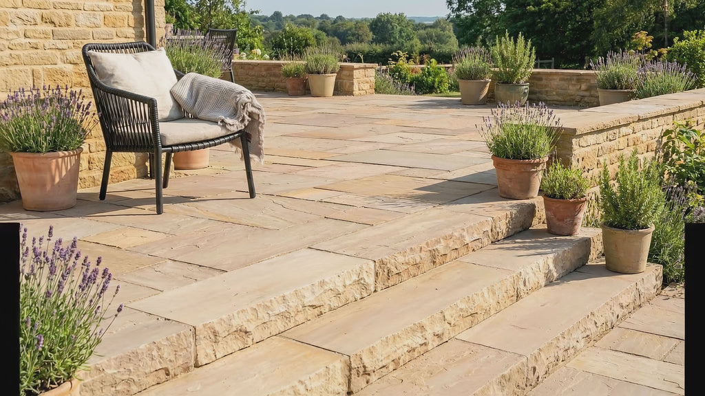 Sahara-sandstenen står smukt alene, men kan også kombineres med andre natursten for at skabe spændende kontraster. Overvej at bryde de gyldne farver med en mørk granitflise, Spanish Black på reposen, eller skab en rød tråd gennem haven ved at matche med belægning i sandsten i romersk mønster.