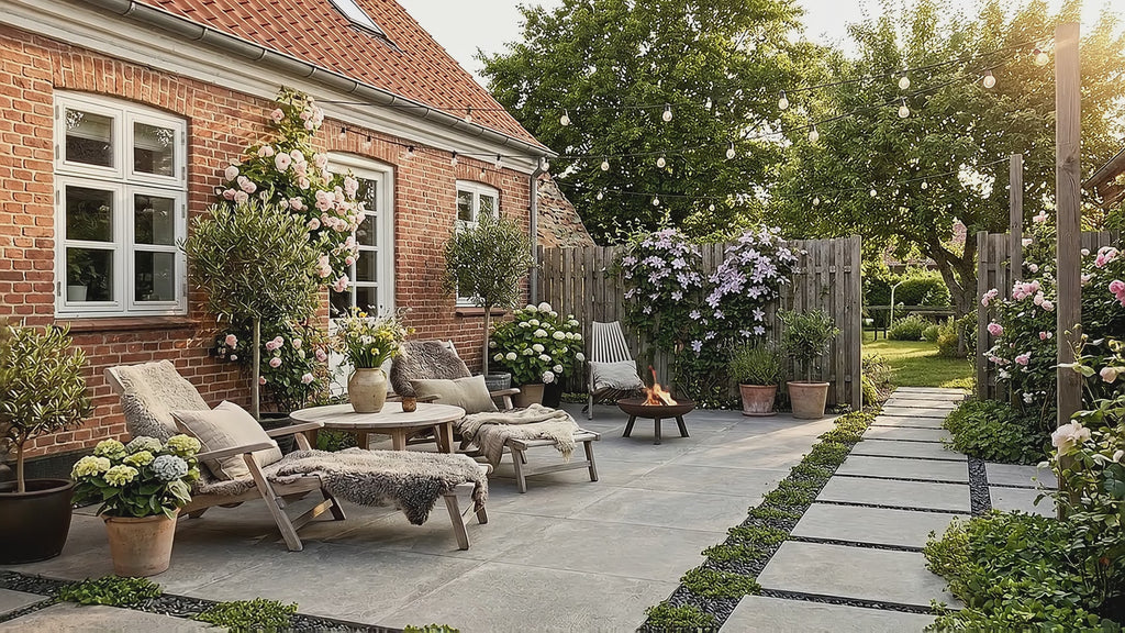 Den grå nuance i Stage-flisen fungerer fantastisk som en rolig base, der kan styles med forskellige elementer. Mange af vores kunder vælger at afslutte terrassen med en kant af natursten eller lægge et bed langs fliserne med sorte granitskærver. Den dybe sorte farve i granitten giver et eksklusivt modspil til den lysegrå keramik og fremhæver flisernes rene linjer.