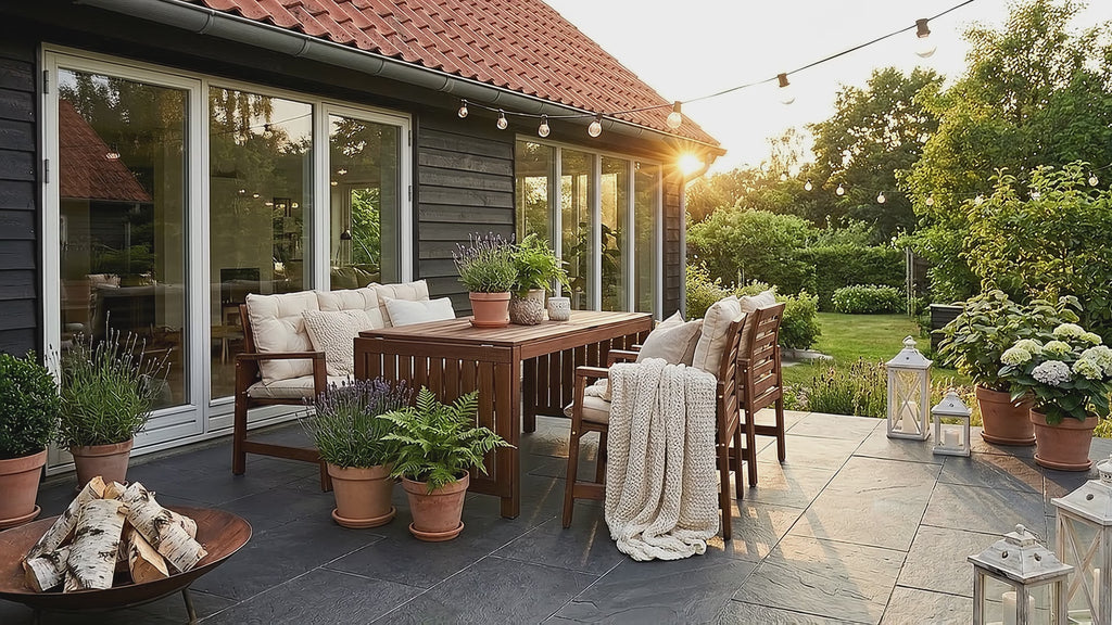 For at skabe en smuk kontrast til den mørke flise, anbefaler vi at afslutte arealet med sorte granitskærver langs husmuren eller i bedene omkring terrassen.