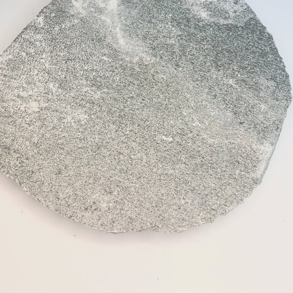 Utrolig smuk og eksklusiv trædesten i grå håndhugget Kavala skifer, med en tykkelse på ca. 3 cm, som er anvendelig i græs, bede og andre stier.
